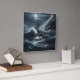 This stunning design depicts a ship tossed in the sea with a rocky cliff nearby. A lighthouse stands tall and bright to guide the ship. Beautiful shades of blue.