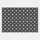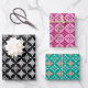 Wrapping paper in a traditional Japanese Shippo, or "seven treasures" pattern of interlocking circles with a central flower motif - flowers in shades of grey with a black and white patterned background, flowers in pastel and fuchsia pink with a deep pink and burgundy wine patterned background, and flowers in coral orange and teal with a turquoise and light aqua patterned background