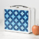 Lunch box in a traditional Japanese Shippo, or "seven treasures" pattern of interlocking circles with a central flower motif - light blue and white flowers with an indigo and denim blue patterned background