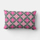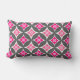 Lumbar pillow patterned in a traditional Japanese Shippo, or "seven treasures" patterned of interlocking circles with a central flower motif - flowers in deep and pastel pink with a silver grey / grey and white patterned background