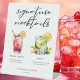 This chic signature mocktails menu pedestal sign features custom black typography above 2 non-alcoholic drinks and their ingredients for your wedding bar. A cute Shirley Temple and virgin Mojito drawing add a cool flair to your bar menu. Complete with the couple's names and date for their reception.