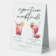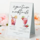 This chic signature mocktails menu table tent sign features custom black typography above 2 non-alcoholic drinks and their ingredients for your wedding bar. A cute Shirley Temple and Virgin Strawberry Daiquiri drawing add a cool flair to your bar menu. Complete with the couple's names and date for their reception.