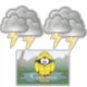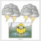 Penguin in yellow rain hat and slicker standing in the rain in a puddle as lightning strikes above, to personalise.