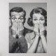 A striking black-and-white vintage-style portrait of a surprised couple with wide-eyed expressions and hands covering their mouths, capturing a classic retro vibe perfect for posters, prints, and nostalgic décor lovers.