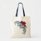 Tote bag with Shocking Hibiscus print and blue swirls.