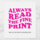 You're pregnant! Congratulations, now it's time for sharing your news with family, friends and co-workers. This modern chic Pregnancy announcement wine labels are a great way to share your special news. Customise Wine or sparkling wine Bottles with this modern label for the perfect way to announce your pregnancy! This label will make your pregnancy reveals super easy, fun and surprise… Design feature with "Always Read The Fine Print", retro wave typography colour. just buy a bottle of wine, remove the front label and apply new one for the perfect personalised gift. Add your custom wording to this design by using the "Edit this design template" boxes on the right-hand side of the item or click the blue "Customise it" button to arrange the text, change the fonts and colours and to also add additional information or images to this design. Click "Customise Further" to open full editing options