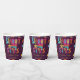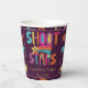 Make your graduate feel like a star with personalised graduation party supplies. These paper cups feature the slogan SHOOT FOR THE STARS in brightly coloured painted style lettering against a dark purple background with your own custom congratulations message and class of year in yellow script style lettering. The rest of the cup has a pattern of colourful stars against a purple background.