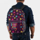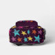 Start your school year off with some positivity. This patterned backpack features the slogan SHOOT FOR THE STARS on the front pocket in bright coloured painted style lettering in blue, yellow, orange, pink and lavender against a dark purple background, which coordinates with the bags colourful star pattern.