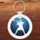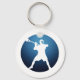 Locked, cocked and ready to rock. Silhouette of lacrosse player in the midst of firing a shot on goal. Circular emblem design in blues with emanating rays.