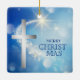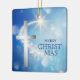 Here's a beautiful Christmas ornament that reminds everyone what the true meaning of Christmas is. It shows a glowing shooting star against a starry blue night sky. The shooting star curves towards a glowing silver cross. The blue text at the side says MERRY CHRIST-MAS. Both sides of the ornament have the same image and text.