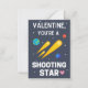 This cool Valentine's Day card features three shooting stars in space with the words, "Valentine, you're a shooting star". Stars, the Earth, and two other planets are in the background, and a pink heart floats in the bottom right hand corner. This card is great for kids who need to bring Valentines into the classroom. The back includes customisable text where you can add your child's name. Check out the collection for four more space-themed classroom cards.