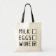 Funny shopping tote bag with all the 'essentials' listed; milk, eggs and wine (of course!).
