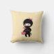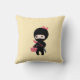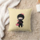 Cute cartoon ninja girl dressed in black but for a pink bow on top of her head mask. Traditional Japanese katana sword can be seen strapped to her back, it’s handle also coloured pink. The girl is holding a pink shopping basket.