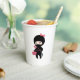 Cute cartoon ninja girl dressed in black but for a pink bow on top of her head mask. Traditional Japanese katana sword can be seen strapped to her back, it’s handle also coloured pink. The girl is holding a pink shopping basket.