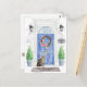 Announce your new address with our stylish announcement featuring a American Shorthair Brown Tabby, blue front door, welcome mat, slate sign, topiaries and a floral wreath set on a grey brick background.