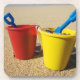 Two sets of brightly coloured shovel and pails on a sandy beach.