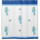 Shower curtain shown in a mix of seashore colours of Royal Blue, White, Cornflower Blue and Sky Blue. Fun seahorses of Blue/Green-Multi print all over with Royal Blue wide solid border at top with a Sky Blue and White stripe; and at bottom, a Royal Blue slightly thinner border with same combination colour of stripes. Customise this item or buy as is.