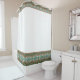 This lovely Arts and Crafts Shower curtain, features a top and bottom border of Metallic copper Gingko leaves on a textured green background. The largest part of the curtain is white. The Gingko Bilabo leaf is a classic Arts and crafts motif. The unique aspect of this design is that it comes from images of actual handmade tiles, by Oregon tile maker Fay Jones Day