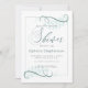 Modern and classic, these shower invitations have a pale mint green background with jade green calligraphy and accents. Hand Written font calligraphy that says "shower". Complimentary reverse colour in sage green. We created this template to make it easy for you to personalise with your own information. This is part of a coordinated wedding stationery suite.