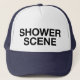 SHOWER SCENE fun and ironic slogan on trucker hat, black, funny typographic statement, inspired by tv comedy character frank rossitano