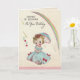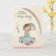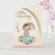 On the front there is a little girl in a blue gown that has pink bows on it. She is carrying a blue frilly umbrella to cover her blonde curls from the rain . Above her is a beautiful rainbow. Inside it has stopped raining, the sun is out and she is leaning on her umbrella posing. Don't let the showers on your birthday bring you down. The precious look on this little girls face is cheer enough! Check out it's matching postage. All card designs are at least 55 years old, and are digitally recreated for todays use.