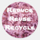 Promote YOUR message on this round sticker  using the template text over the subtle pink shredded crinkled paper background or keep this environmental message or keep this environmental message.