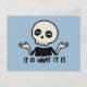 A cute, indifferent skeleton shrugging its shoulders with the caption "It Is What It Is." Great for nihilistic humour and daily vibes.