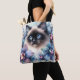 This tote bag features feline watercolor artwork of a blue-eyed Siamese cat surrounded by orchids in cool colors such as pastel blue and purple.