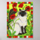 Decorate your walls in style with this unique, colourful small folk art poster. In this uplifting, whimsical artwork, this beautiful long-haired Siamese cat is sitting in a field of gorgeous red oriental poppies. The entire scene is surrounded by a matching border.