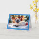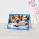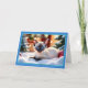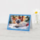 The front of this Christmas card features a delightful image of a Siamese kitten with striking blue eyes, sitting calmly in a snowy scene. The kitten's fur stands out against the snow, and it is framed by festive holiday decorations, including a Christmas tree and ornaments, suggesting a cosy, warm atmosphere. The text "Merry Christmas" is written across the top in an elegant font, creating a cheerful holiday greeting. The background has warm, golden tones, likely from indoor lighting, which adds to the festive and comforting ambiance. The card's border is a vibrant blue, enhancing the visual appeal and complementing the kitten’s blue eyes.
