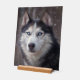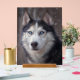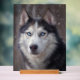 This digital painting depicts a Siberian Husky standing on snow, its fur glistening with frosty highlights as the winter landscape stretches endlessly behind it. The dog’s expressive eyes catch the viewer’s attention.