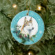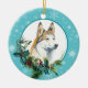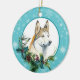 On the front of this Holiday ornament is a majestic portrait of a Siberian Husky Dog looking out from a holly and evergreen bough. Red berries and pine cones decorate the holly and pine sprigs.The image is placed on a white circle framed by a retro blue snowflake pattern. The back of the ornament has the same background and circle with your custom text in blue on a white background. Perfect for anyone who has lost their heart to a Husky.