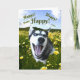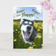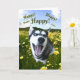 A cute and happy husky smiles on the cover. Let someone know that thinking of them makes you so happy!