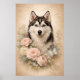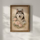 A vintage-style illustration featuring a Siberian Husky with striking blue eyes, surrounded by soft pink roses and delicate white blossoms. The composition is set against an antique-inspired textured background, highlighting the detailed fur and gentle botanical elements for a classic and elegant pet portrait.