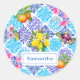Summer Sicilian blue yellow floral colourful azulejo Amalfi Mediterranean majolica Round Sticker. Chic floral botanical citrus garden pattern inspired by the summer bright italian themed art of majolica. Beautiful Sicilian ceramic tiles in pink yellow and blue. A fun style bright design for home decor, clothes, mobile and Ipad cases, invitations and much more. You can change all text colours and fonts, click to customise further underneath the text customisation area this will take you into the design tool. A unique gift for birthdays, holidays and any special occasion. Whether for valentines day, Christmas or as a gift in general it makes a great gift idea