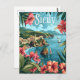 A vivid and nostalgic depiction of a tropical beach in Sicily, showcasing the island’s stunning coastal beauty. The design features golden sands, clear turquoise waters, and lush palm trees against a backdrop of serene Mediterranean scenery. Rendered in a vintage style, the artwork evokes the relaxing and exotic allure of Sicily’s tropical beaches, inviting viewers to experience its sun-drenched shores and tranquil ambiance.