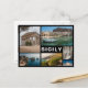 Postcard of a collage with multiple photos of beaches, Roman temple, Scopello, salt pans and Cefalù on the island of Sicily in Italy in a black frame with the text: 'Sicily'.