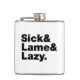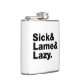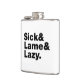 The flask itself is fine. It’s a cheap flask, obviously bought in bulk, however am prepared to overlook that. Given that it is a personalized item, I would have liked to have seen gift boxing instead of the generic packaging. Terrible printing, and/or quality. It’s a cheap, tacky vinyl. It is not cut straight and is also applied in a way that it is overhanging the bottom, causing the glue to catch on items and it will eventually roll and tear, damaging the wrap.