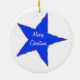 Whimsical Sidney Salamander looks like he enjoys swinging on this bright blue star. Fun colourful fanciful rendition design on keepsake Christmas ornament for kids and adults. All text may be personalised in template provided. Original art and design by Anura Design Studio.