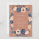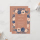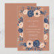 This design showcases deep navy blue roses and creamy white anemones set against a warm sienna background. The arrangement includes delicate dusty blue berries and foliage that surround the central area. It offers a sophisticated and moody aesthetic ideal for a late season or autumn event.