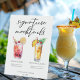 This chic signature mocktails pedestal sign features simple black tyopgraphy above 2 cute drinks and their ingredients for your wedding bar. A Shirley Temple and non-alcoholic virgin Piña Colada add a cool flair to your bar menu. Complete with the couple's names and date for their reception.