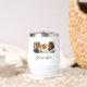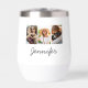 The Signature Strip Collage wine tumbler has a photo strip layout featuring three rectangular photos across a crisp white surface. A flowing script name adds a soft finish, creating a sleek blend of photo and text elements in this structured drinkware design.
