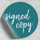 A simple "signed copy" custom design in modern minimalist handwritten script typography in an informal casual style in white on an teal background. The perfect book signing accessory for any author or writer! #signedcopy #sticker #author