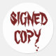 A sticker label to indicate a book, magazine, article, photo, etc., has an author's / illustrator's/ artist's/ photographer's autograph attached.