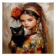 A captivating artwork in a rich oil painting style, portraying a girl with innocent features and wide eyes, her hair adorned with a vibrant red flower, as she tenderly holds a black cat with piercing golden eyes. The piece skillfully blends warm earthy tones with bold brushstrokes, giving it a classic character with a modern spirit, full of emotion and warmth.