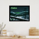 Features a night scene in the far north. Night has fallen and there is a hint of the Northern Lights beyond the mountains on the horizon. Moonlight reflects off the snow-covered landscape. An owl sits in a dead spruce tree seeking voles. Text reading "Alaska" also appears in glowing green and white.