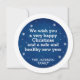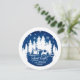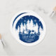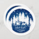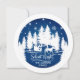 Christmas round sticker featuring white pines silhouettes with snowflakes and a horse-drawn sleigh on a blue background, with the wording Silent night in handwritten lettering. Easily customisable by adding your own family name or text