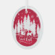 Christmas glass ornament featuring white pines silhouettes with snowflakes and a horse-drawn sleigh on a festive red background, with the wording Silent night in white handwritten lettering.