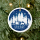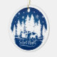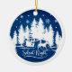 Christmas ceramic ornament featuring white pines silhouettes with snowflakes and a horse-drawn sleigh on a blue background, with the wording Silent night in handwritten lettering. The back is easily customisable by adding your own family name and photograph