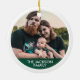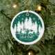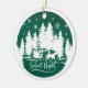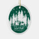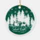 Christmas ceramic ornament featuring white pines silhouettes with snowflakes and a horse-drawn sleigh on a green background, with the wording Silent night in handwritten lettering. The back is easily customisable by adding your own family name and photograph